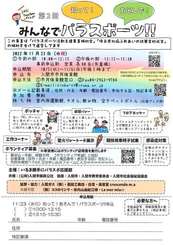 令和4年11月23日(水祝)に入間市市民体育館にて、 第2回知って!あそんで!みんなでパラスポーツが
